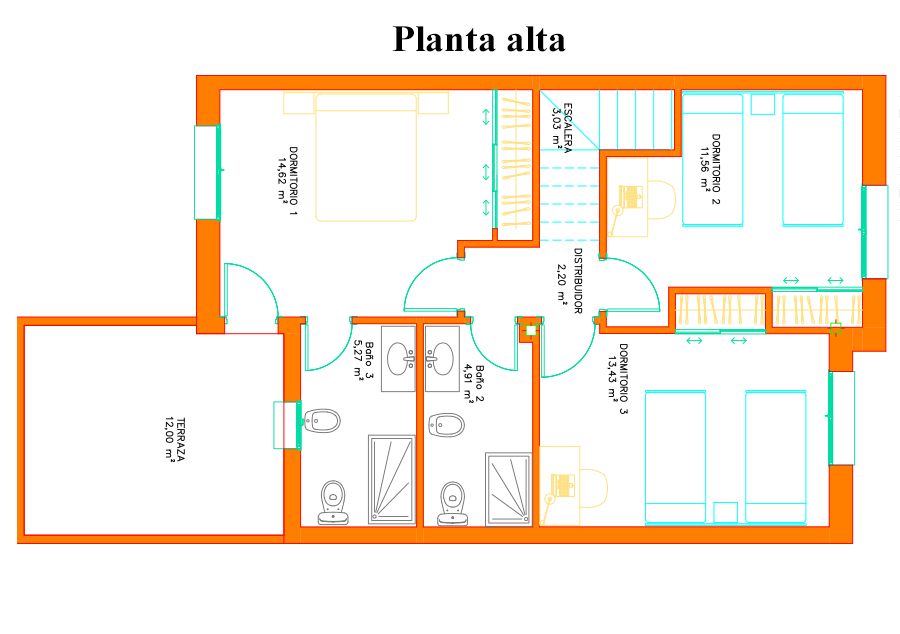 En la planta primera dispone de 3 dormitorios con armario empotrado, dos baños y distribuidor.