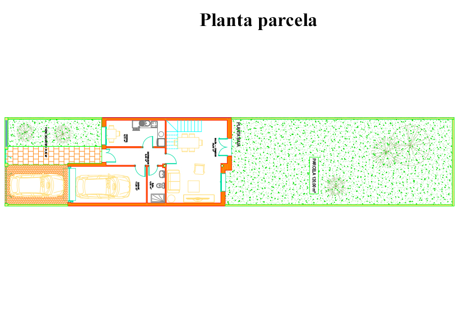 Plano de la parcela con planta baja, patio delantero y jardín trasero