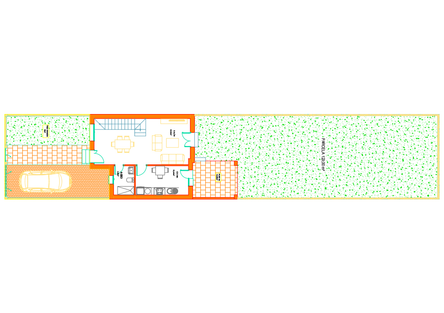 Plano de la parcela con el patio delantero, la vivienda y el jardin trasero